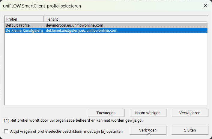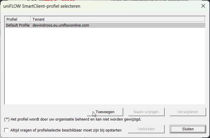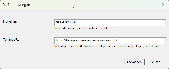 - Tenant-URL: Geef hier het webadres in van de uniFLOW-server van de school je wil toevoegen.